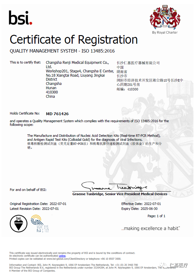 近(jìn)日(rì),延吉市金達萊醫療器械有限公司(以下(xià ×ε)簡稱:仁基醫(yī)療)正式獲得(de)全球頂級認證機(jī)構B≥λ♦SI頒發的(de)ISO13485證書(shū),同時(shí)成為(wèi) ©ε湖(hú)南(nán)省內(nèi)少(shǎo)數(s≥↓hù)幾家(jiā)取BSI-ISO13485α 證書(shū)的(de)IVD企業(yè)之一(yī)。