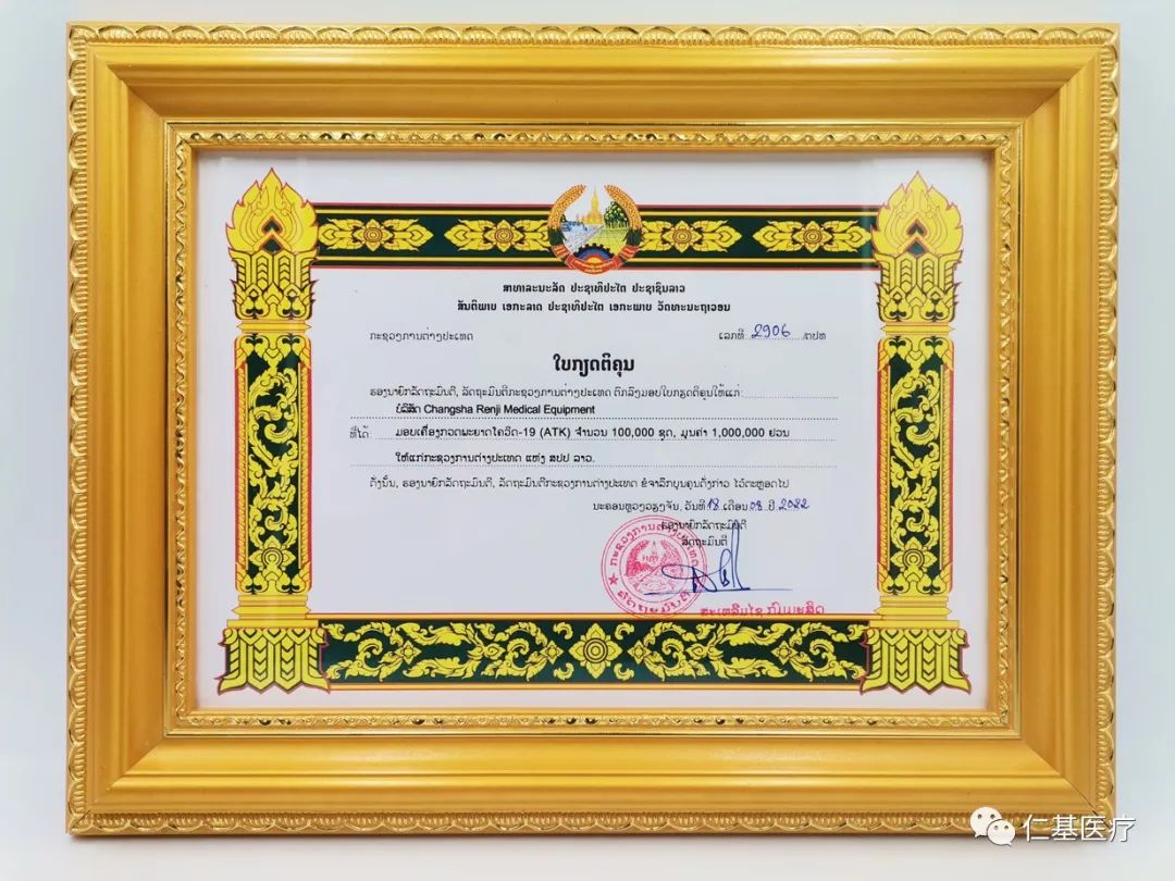 為(wèi)了(le)感謝(xiè)延吉市金達萊醫療器械有限™¥公司(下(xià)簡稱:仁基醫(yī)療)今年(nián)÷¥ λ4月(yuè)份向老(lǎo)撾外(wài)交部捐贈10萬人∞ (rén)份新型冠狀病毒(2019-nCoV)抗原檢測試劑盒!(👈點擊☆♥跳(tiào)轉閱讀(dú)詳情)以及感γ$&謝(xiè)老(lǎo)撾湖(hú)南(nán)商會(huì)在本 ±↑<次捐贈活動中提供的(de)鼎力相(xiàng)δ÷$助。10月(yuè)11日(rì),老(lǎo)撾人(rén)民(mín)↕¶±σ民(mín)主共和(hé)國(guó)駐長(cháng)沙總領>✔事(shì)館特此舉行(xíng)了(le)“♠<¥向仁基醫(yī)療、老(lǎo)撾湖(hú)南(nán)商會(huìε>↓φ)頒發榮譽證書(shū)“的(de)儀式。