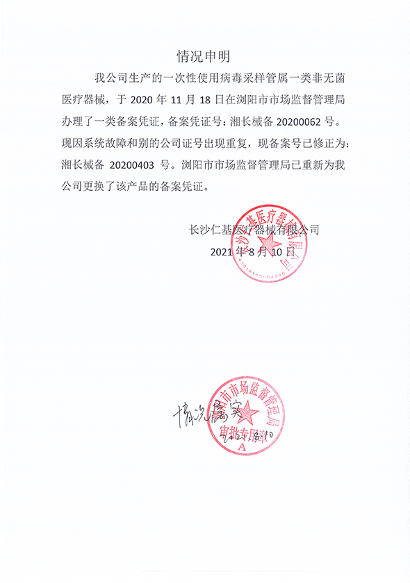 我公司生(shēng)産的(de)一(yī)×≤φ'次性使用(yòng)病毒采樣管屬一(yī)類非無菌醫Ω→γ®(yī)療器(qì)械,于2020年(nián)11月(yuè)18日™ σ✔(rì)在浏陽市(shì)市(shì)場(chǎng)監督管理(lǐ)局辦理(←±lǐ)了(le)一(yī)類備案憑證,備案憑§&證号:湘長(cháng)械備20200062号。現(xiàn)因系統故障©和(hé)别的(de)公司證号出現(xià>δ<≥n)重複,